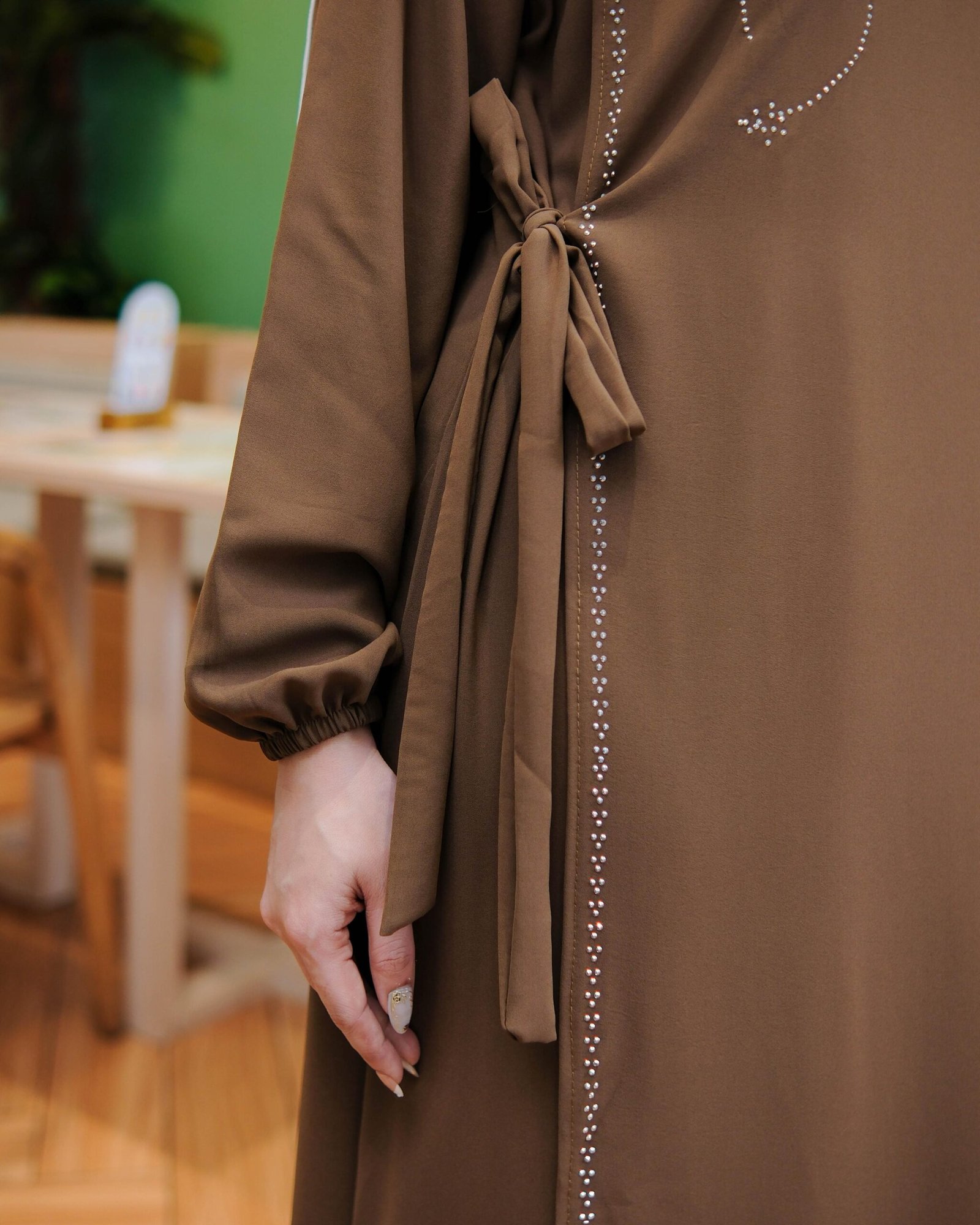 Detail hiasan swarovski motif floral di bagian dada dan garis depan menambah sentuhan mewah tanpa berlebihan. Dilengkapi tali samping yang dapat di-adjust, dress ini mudah disesuaikan dengan bentuk tubuh sehingga tetap terlihat rapi dan proporsional. Bagian lengan panjang dengan ujung karet memberikan kenyamanan dan tampilan yang manis.