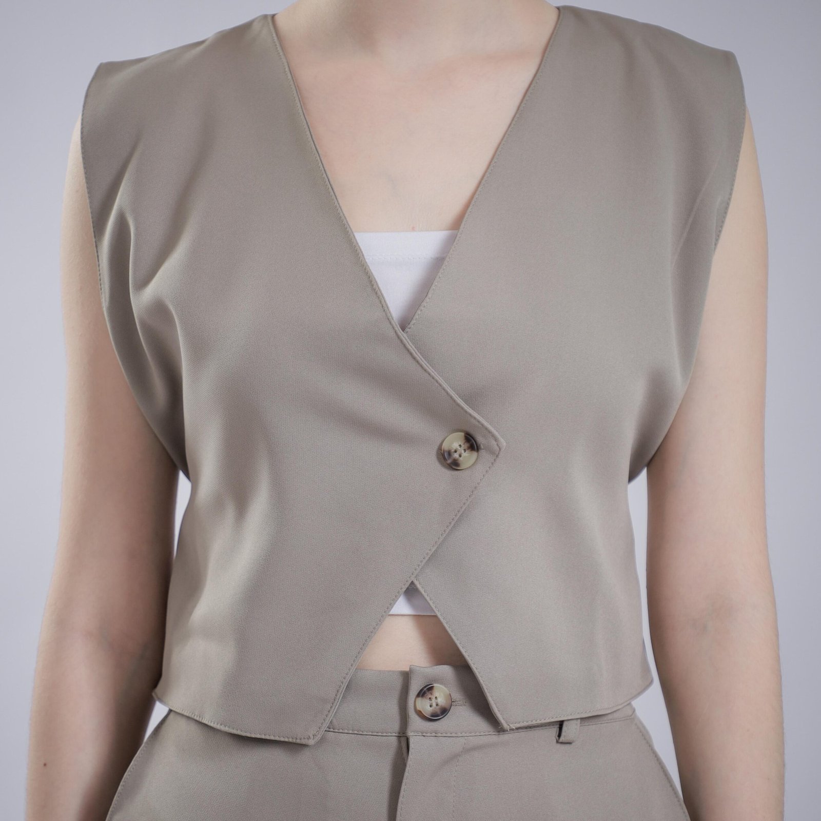 Vest: Tanpa lengan, model V-neck, kancing depan